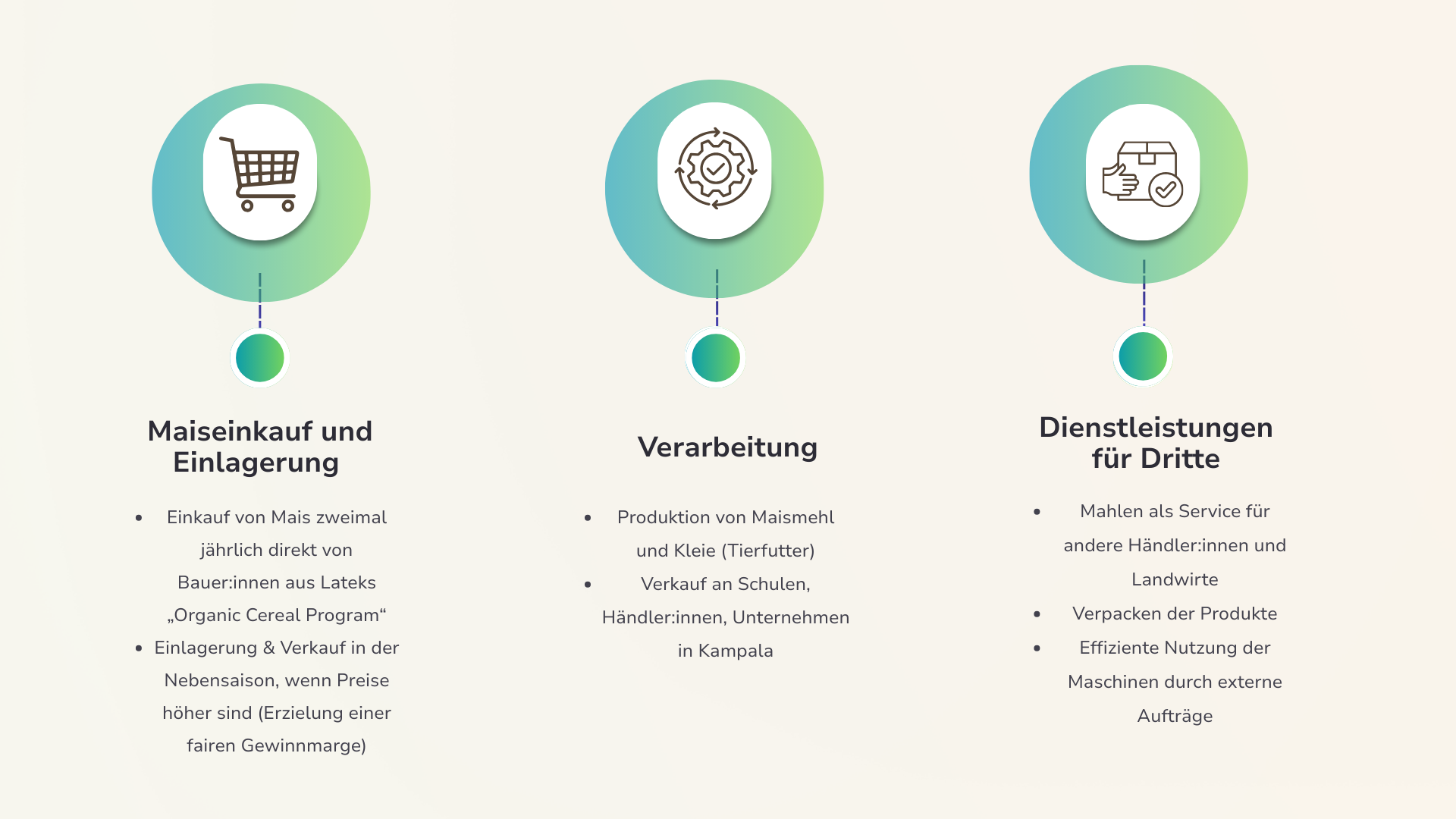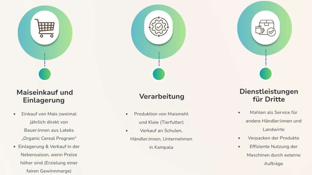 Latek’s Agribusiness Enterprise (LABE) ist ein Social Business in Uganda, das Kleinbauer:innen einen fairen und verlässlichen Absatzmarkt für ihren Mais bietet. LABE kauft Mais zu einem Premiumpreis, verarbeitet ihn zu hochwertigem Maismehl und Maiskleie (Tierfutter) und verkauft diese Produkte an Schulen, Händler:innen und andere Abnehmer:innen, hauptsächlich in der Hauptstadt Kampala.