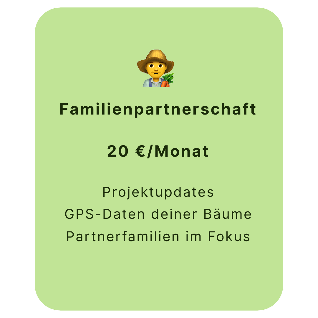 *Beispielsweise kostet ein Baum 10€ und die Begleitung einer Familie 350€ (inkl. Trainings, Saatgut, Baumsetzlingen & Monitoring).